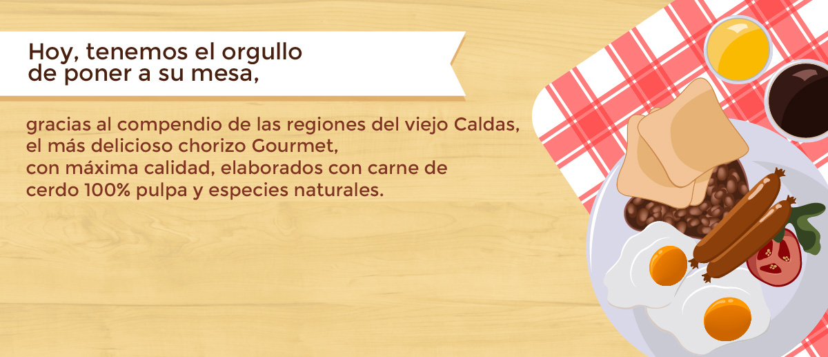 Hoy, tenemos el orgullo de poner a su mesa, gracias al compendio de las regiones del viejo Caldas, el más delicioso chorizo Gourmet, con máxima calidad, elaborados con carne de cerdo 100% pulpa y especies naturales.